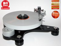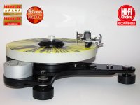Advanced main bearing and solid aluminum arm-board are mounted directly onto the aluminum made sub-plinth which is in turn 3-point coupled (by means of rubber-cork washers of different thickness and diameters) to the main plinth made of cast Acrylic and Derlin (POM) in order to maximize the performance and minimize acoustic break through. The motor assembly machined from Derlin (POM) is rigidly mounted onto the main plinth.